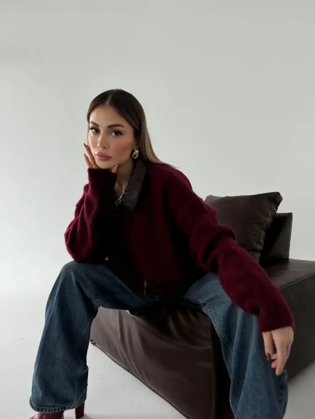 Kadın Kolej Ceket – Kareli Oduncu Kumaş, Kolları Suni Deri, Fermuarlı, İçi Kapitone Astarlı, Nakışlı Oversize Bahar & Kış Stil - Bordo