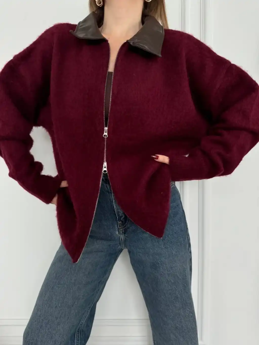 Deri Yakalı Pamuk dokulu Çift Taraflı Çalışan Fermuar Ceket - Bordo