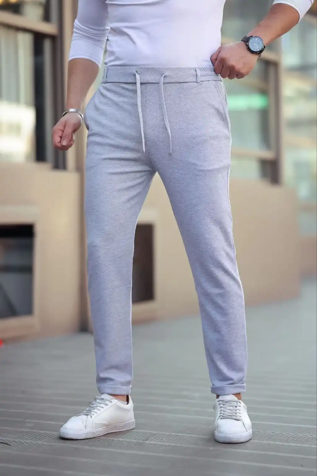 Erkek Cizgili Dokuma Krep Jogger Buggy Pantalon Rahat kalıp - Beyaz