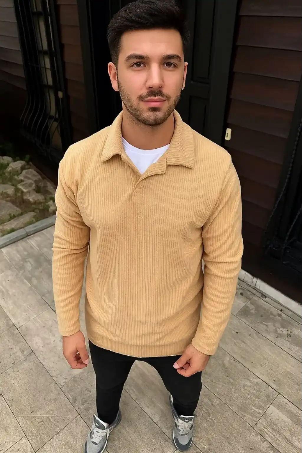 Erkek Fitilli Polar Sweatshirt – Düğmesiz Polo Yaka, Oversize Rahat Kalıp, Kalın Polar Kumaş, Kışlık ve Baharlık Şık Günlük Üst - Bej