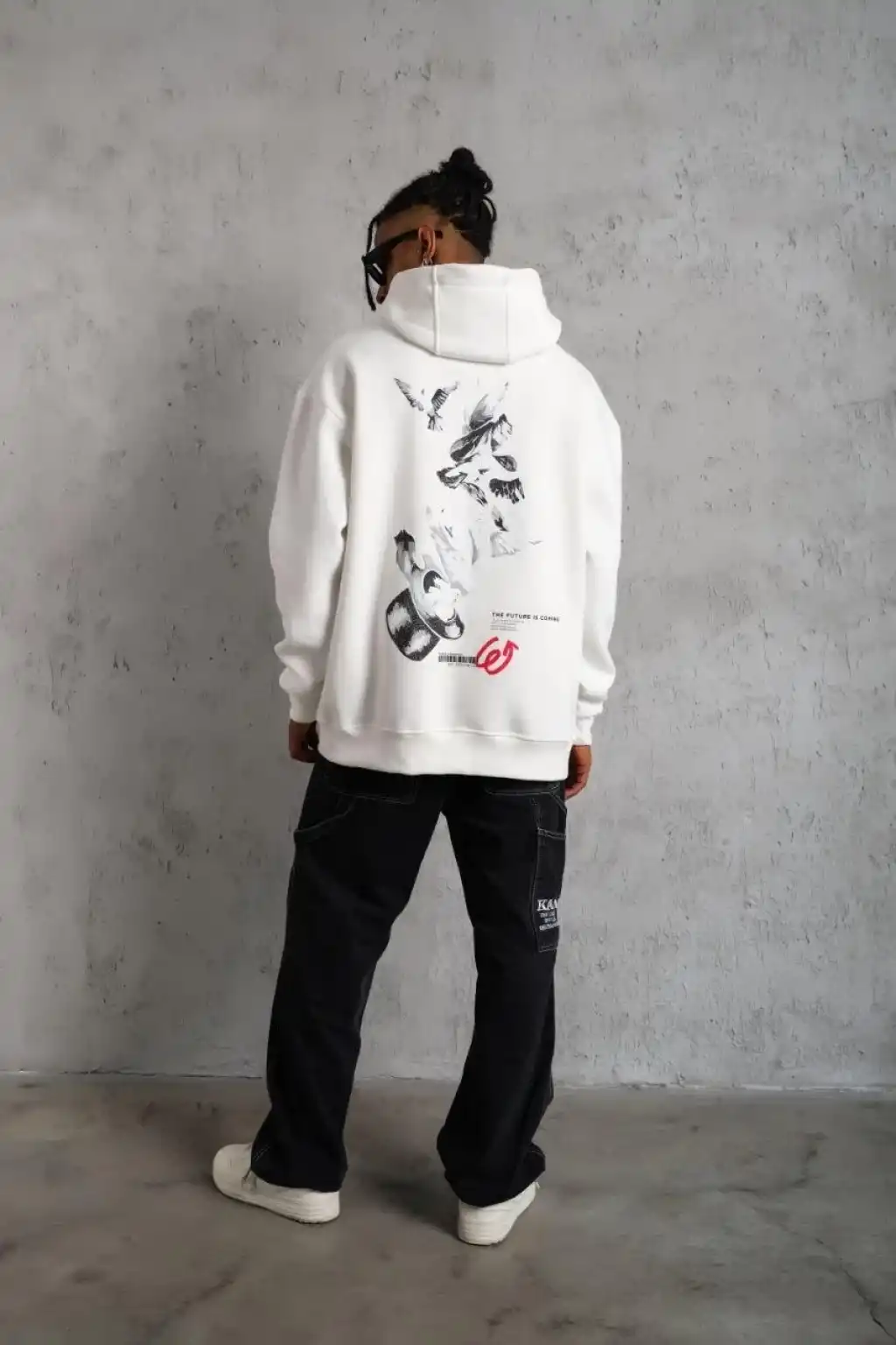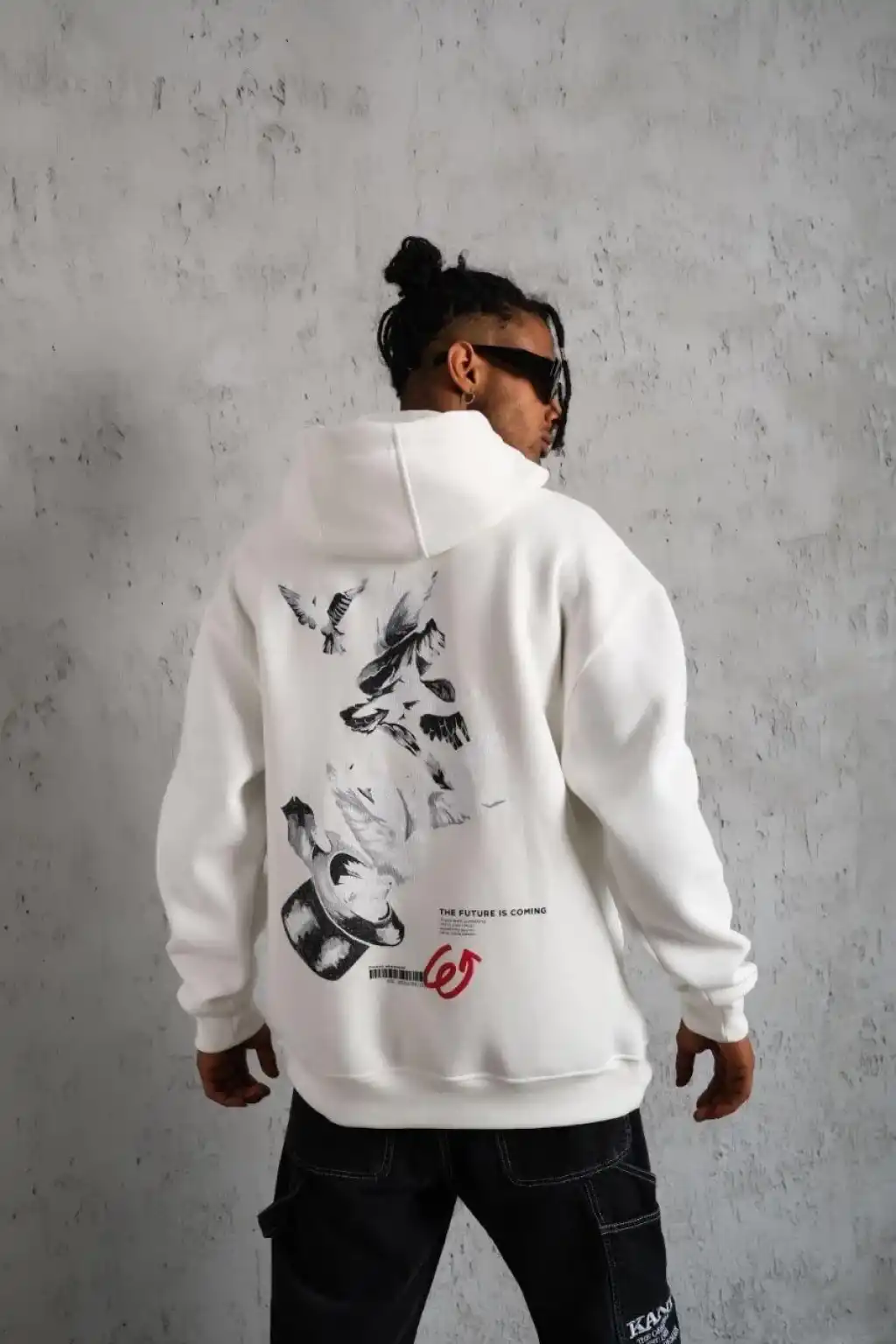 Erkek Şapkalı Güvercin Baskılı Kapşonlu Sweat - Beyaz