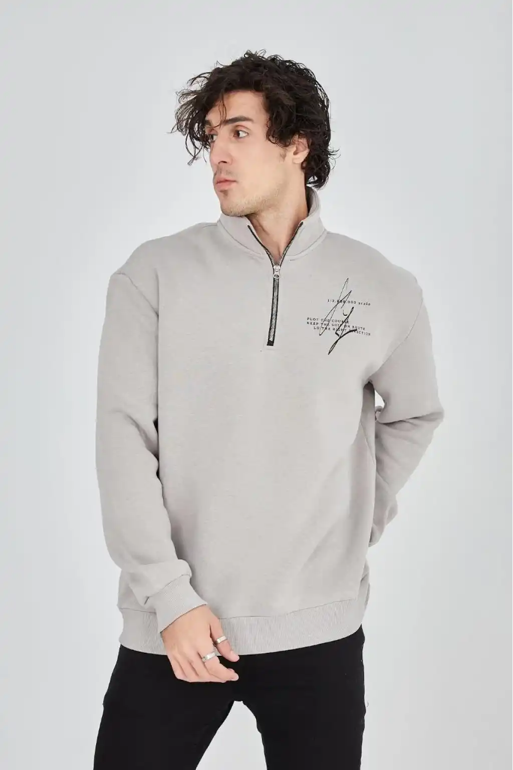 Erkek Yarım Fermuarlı Baskılı Sweat - Boyalı Gri
