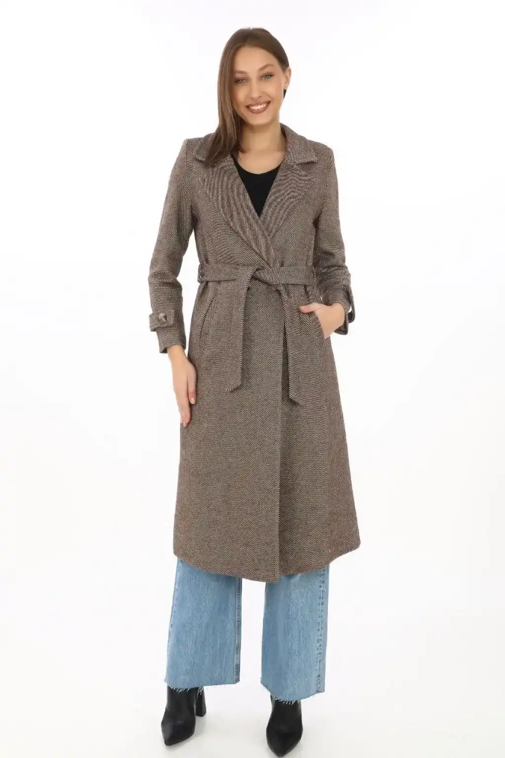 Kadın Astarlı Balık Sırtı Kaşmir Kaşe Kaban - Vizon