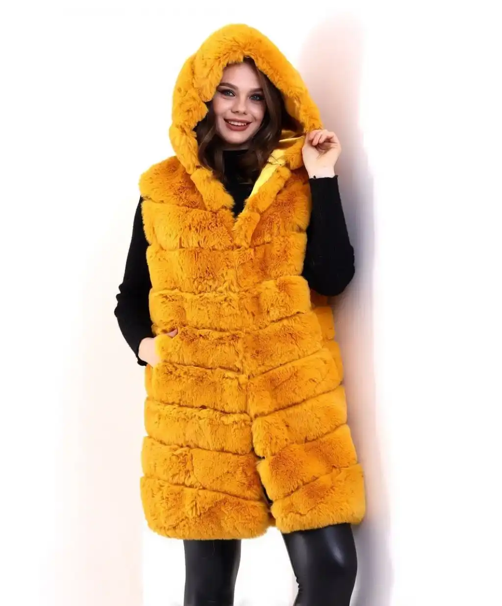 Bu model, standart peluş yeleklerden farklı olarak daha dolgun, daha yoğun tüy yapısına ve tam boy premium saten astara sahiptir. Dış yüzeyi yumuşak dokulu, iç kısmı tok ve konforludur. Soğuk havalarda yüksek ısı tutma performansı sağlar.