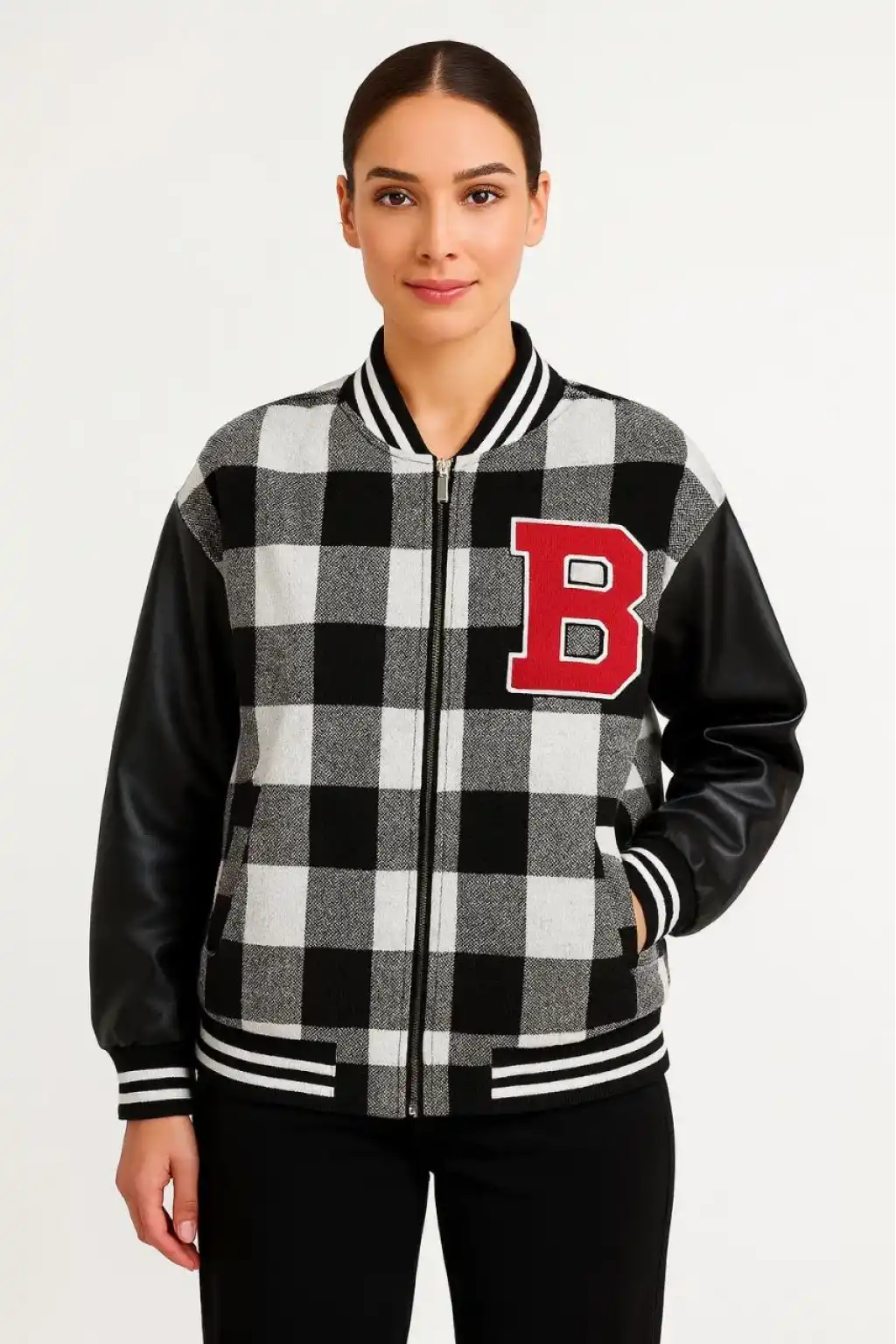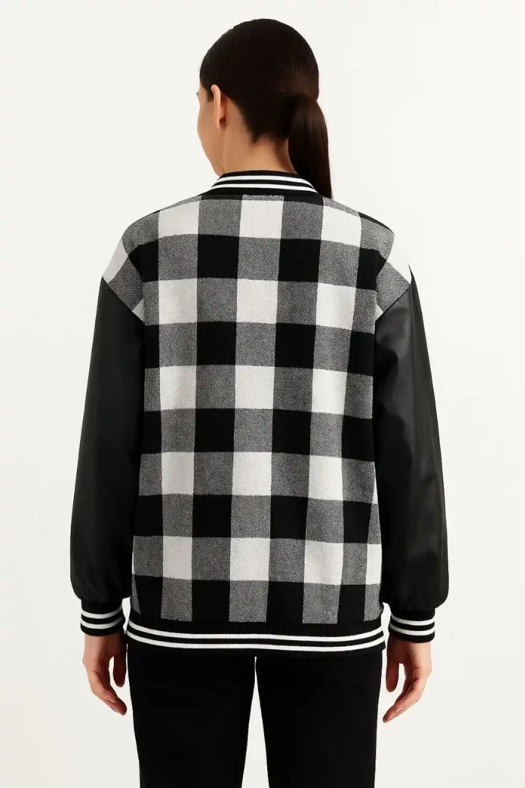 Kadın Kolej Ceket – Kareli Oduncu Kumaş, Kolları Suni Deri, Fermuarlı, İçi Kapitone Astarlı, Nakışlı Oversize Bahar & Kış Stil - Gri