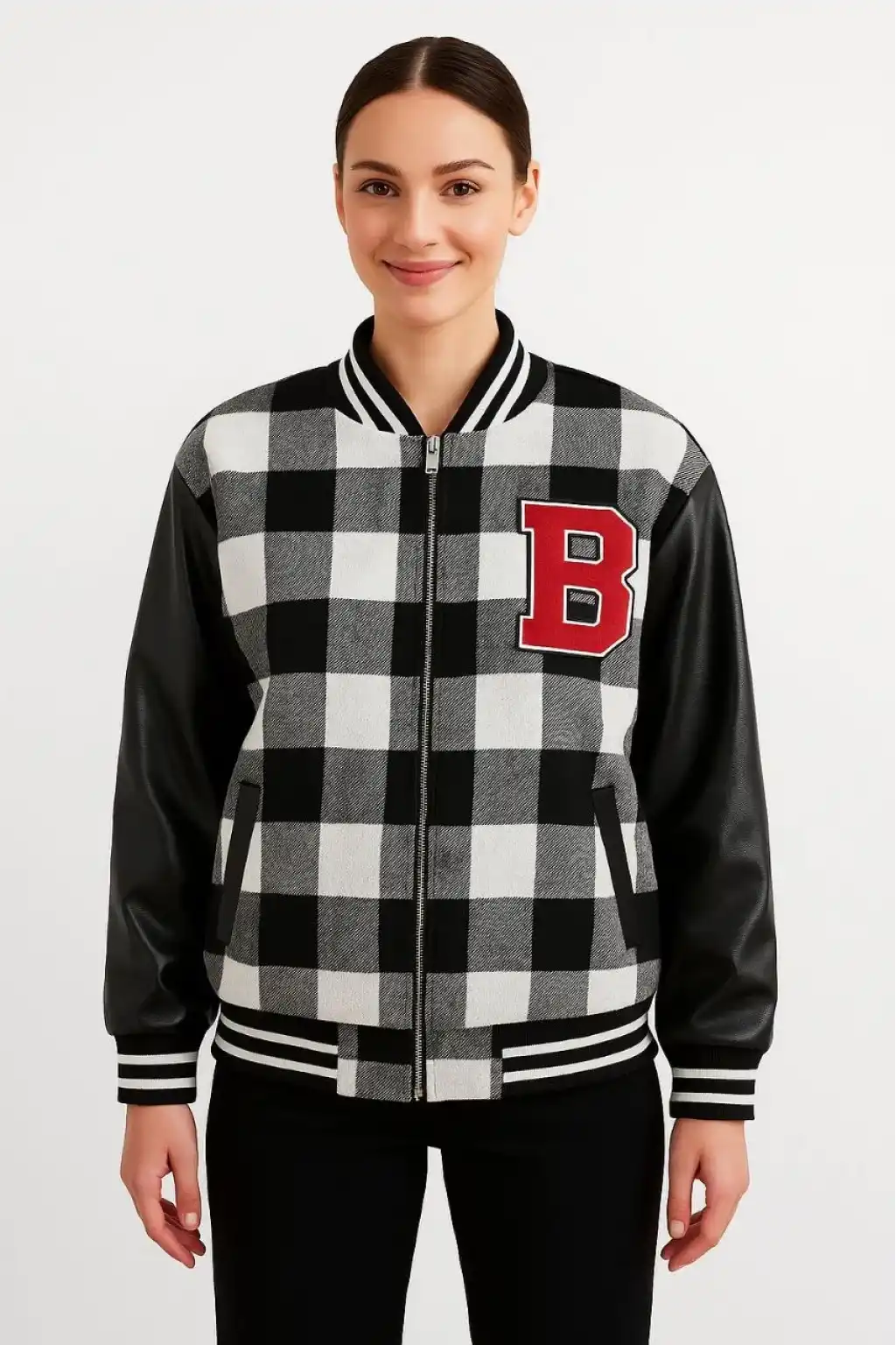 Kadın Kolej Ceket – Kareli Oduncu Kumaş, Kolları Suni Deri, Fermuarlı, İçi Kapitone Astarlı, Nakışlı Oversize Bahar & Kış Stil - Bordo