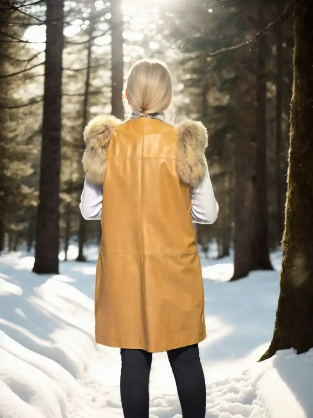 Kadın Kolsuz Hakiki Deri Kürk - Hardal