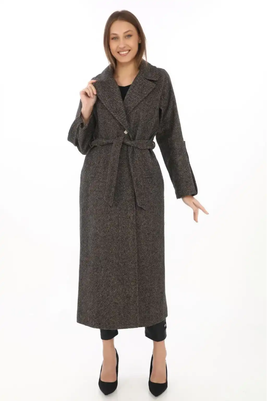 • Kadın Kolu Apoletli Astarlı Kaşmir Kaşe Kaban - Füme