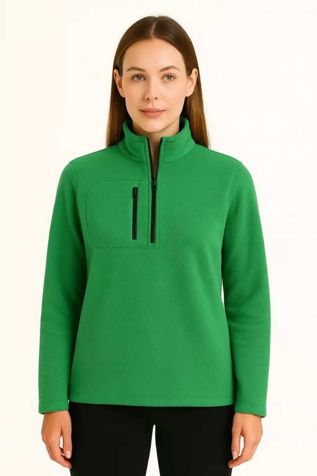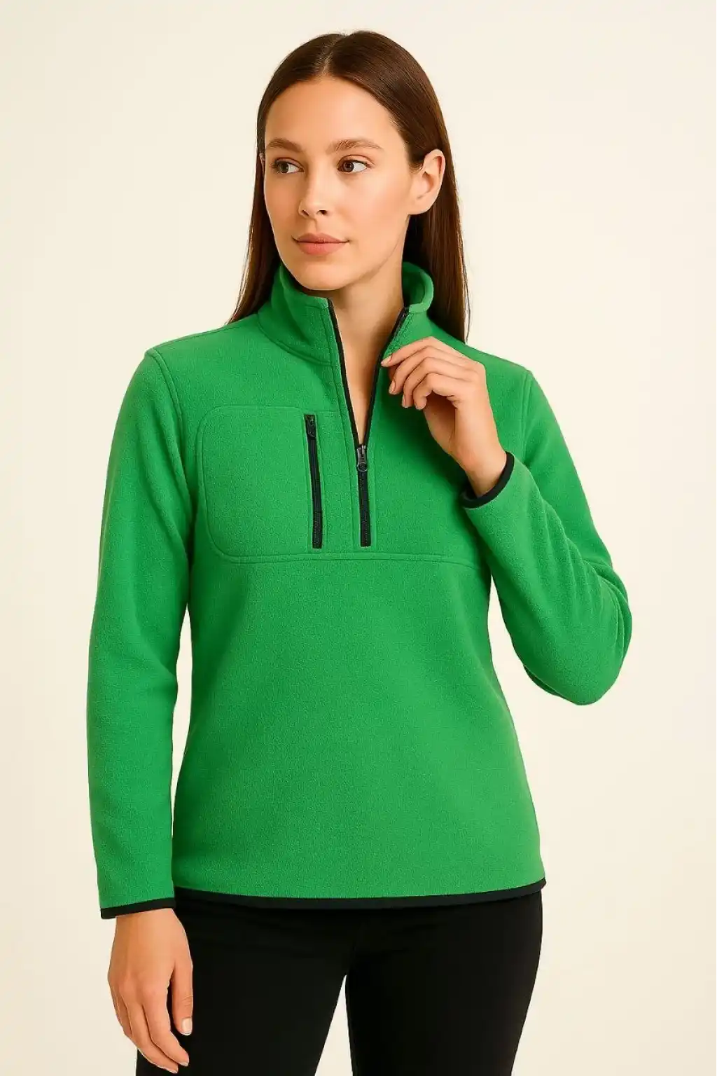 Kadın Polar Kazak – Dik Yaka, Yarım Fermuarlı, Fermuarlı Göğüs Cepli, Siyah Biyeli, Kışlık Rahat Regular Fit Günlük Model - Yeşil