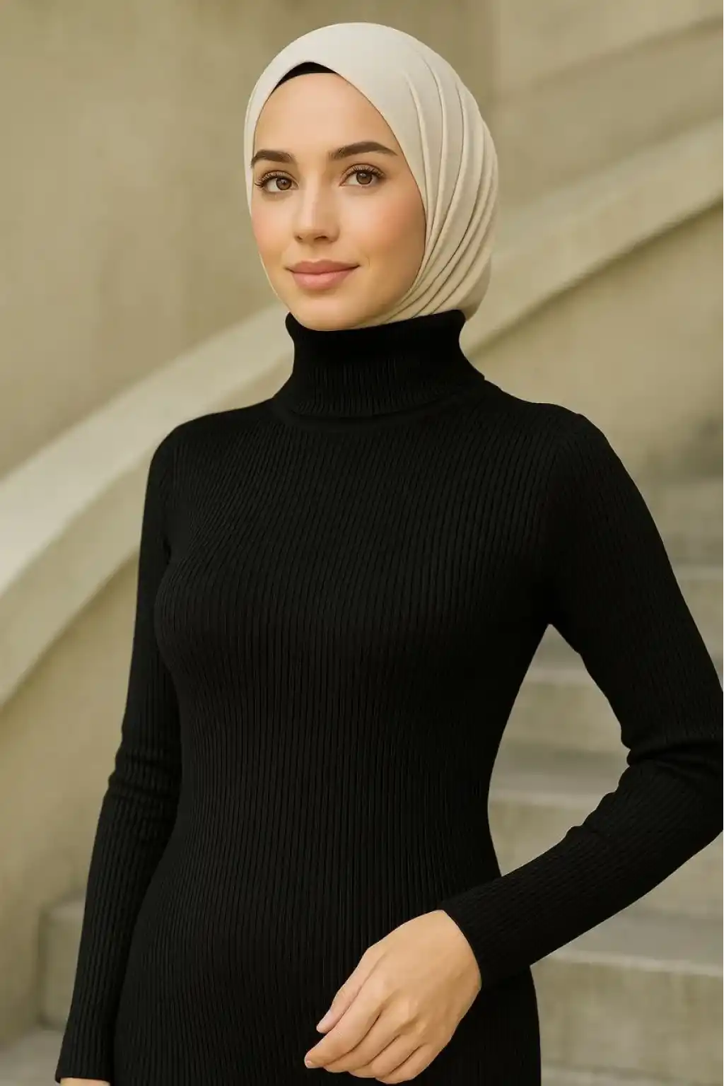 Kadın Tesettür Triko Elbise – Boğazlı Uzun Fitilli Dokuma, Esnek Tam Kalıp, 130 cm Midi Boy, Bahar & Kış Şık Rahat Stil - Siyah