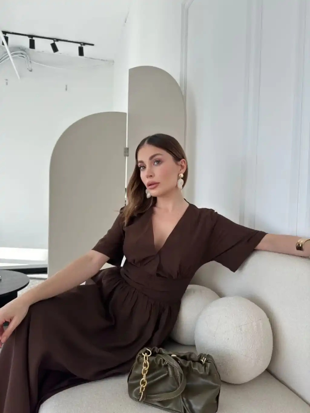 Sırt Dekolteli Kolsuz Uzun Elbise - Kahverengi