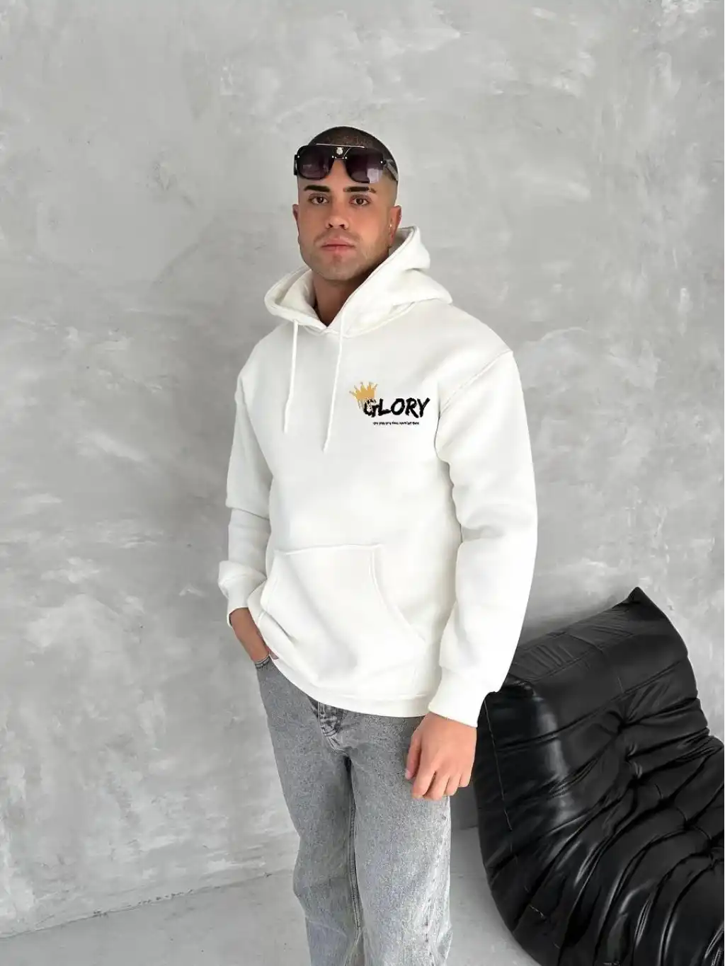 Erkek Oversize Kapüşonlu Sweatshirt – Beyaz Renk Üç İplik İçi Pamuklu Kanguru Cepli Baskılı Hoodie Rahat Kalıp Kışlık Günlük Kombinlere Uygun - Beyaz