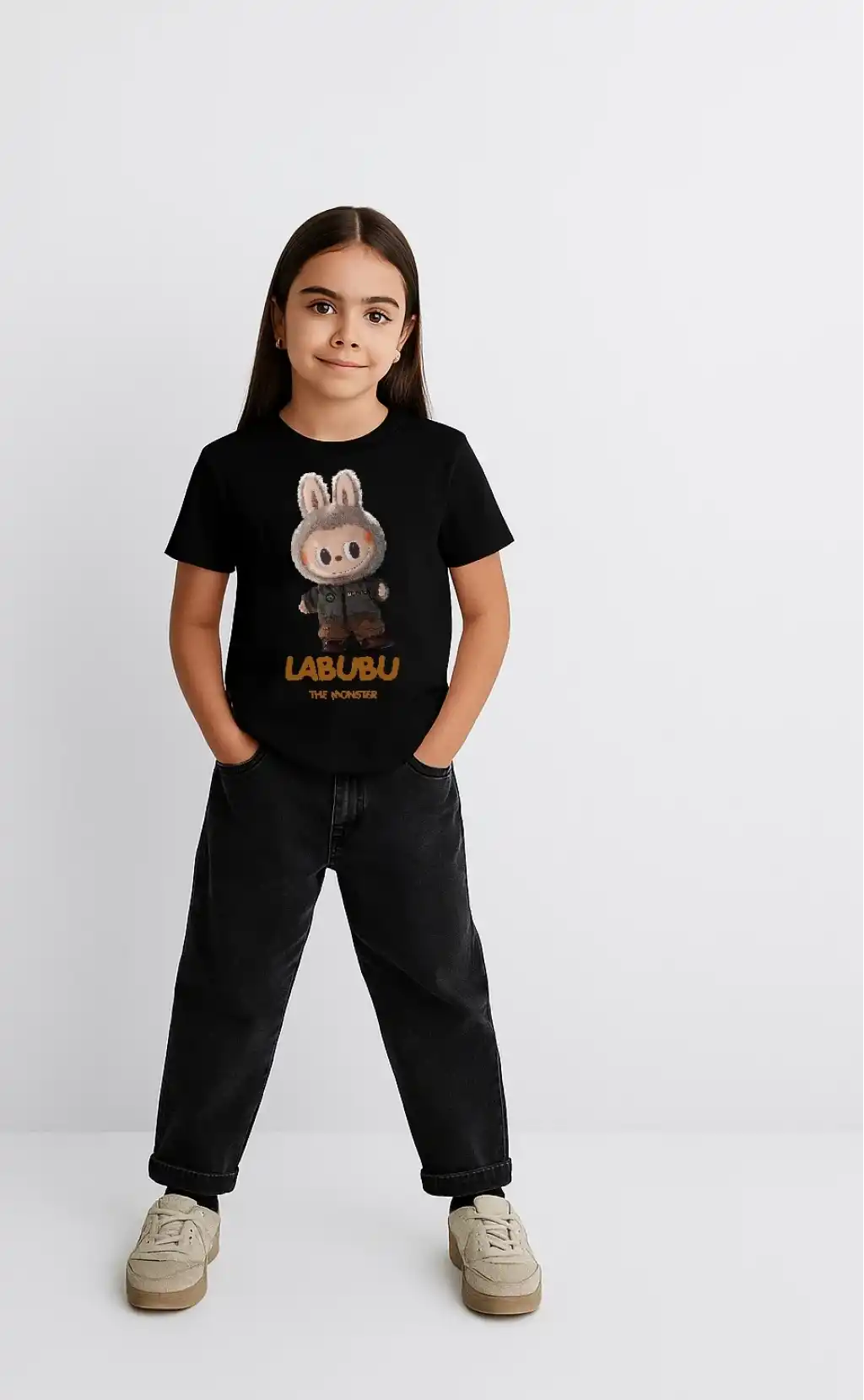 Kız Labubu Çocuk Baskılı T-Shirt - Siyah