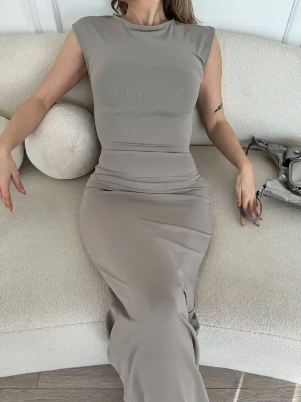 Sırt Dekolteli Kolsuz Uzun Elbise - Kahverengi