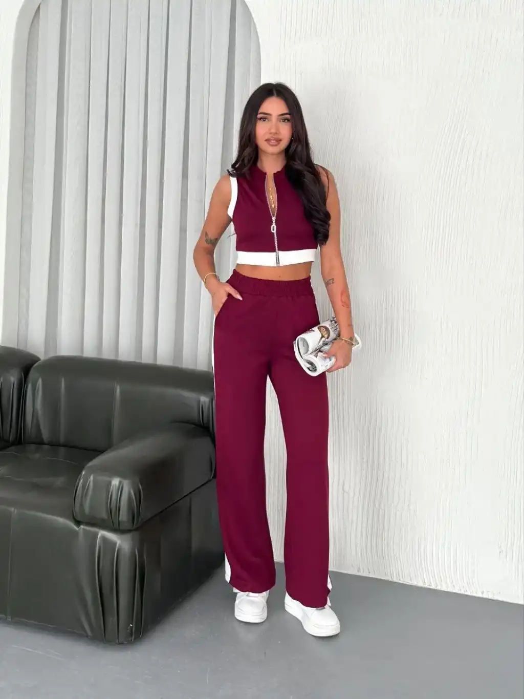 Osy Modal Yumuşak Dokulu Kumaş Tam Fermuarlı Crop Pantalon İkili Takım - Bordo
