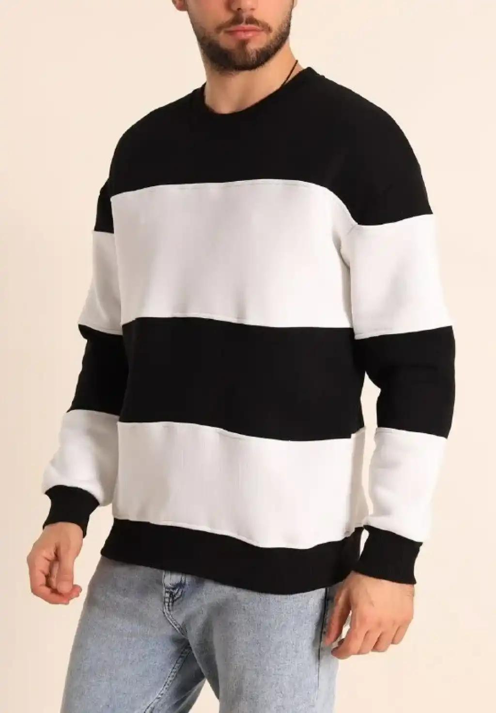 Erkek Patlı Yaka Üç İplik Pamuklu Sweatshirt Double Oversize Rahat Kalıp Günlük Kullanım – Bej