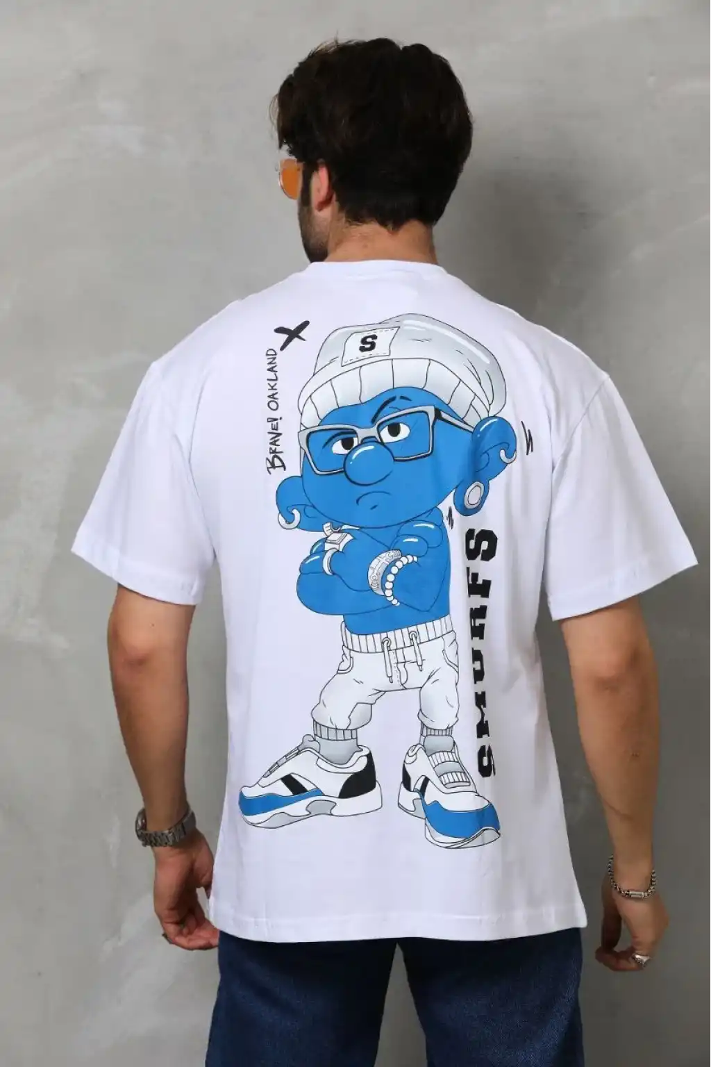 Unisex Bisiklet Yaka Baskılı Oversize T-Shirt - Beyaz