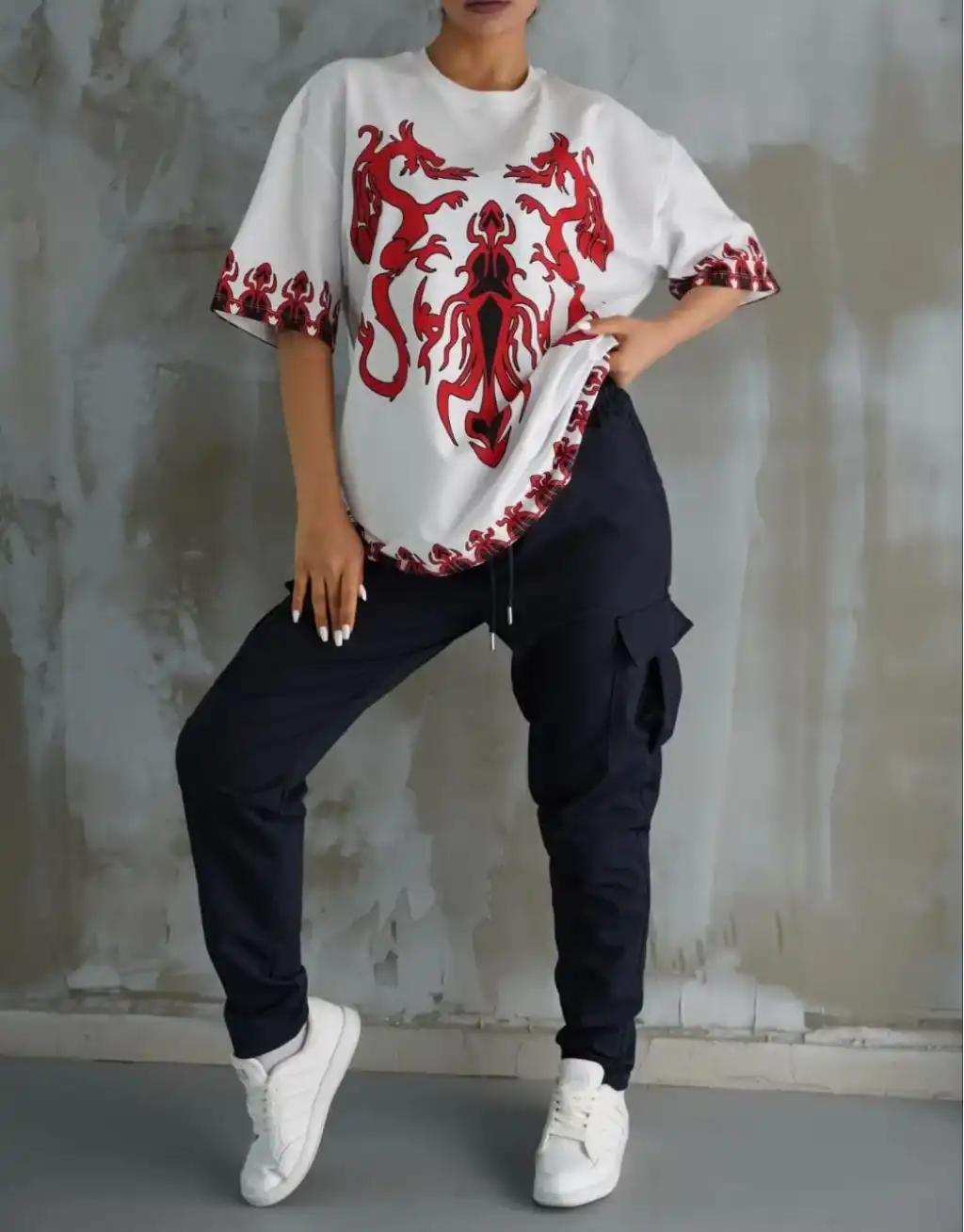 AICG Ön Arka Baskılı Bisiklet Yaka Kadın Oversize Bisiklet Yaka T-shirt - Beyaz