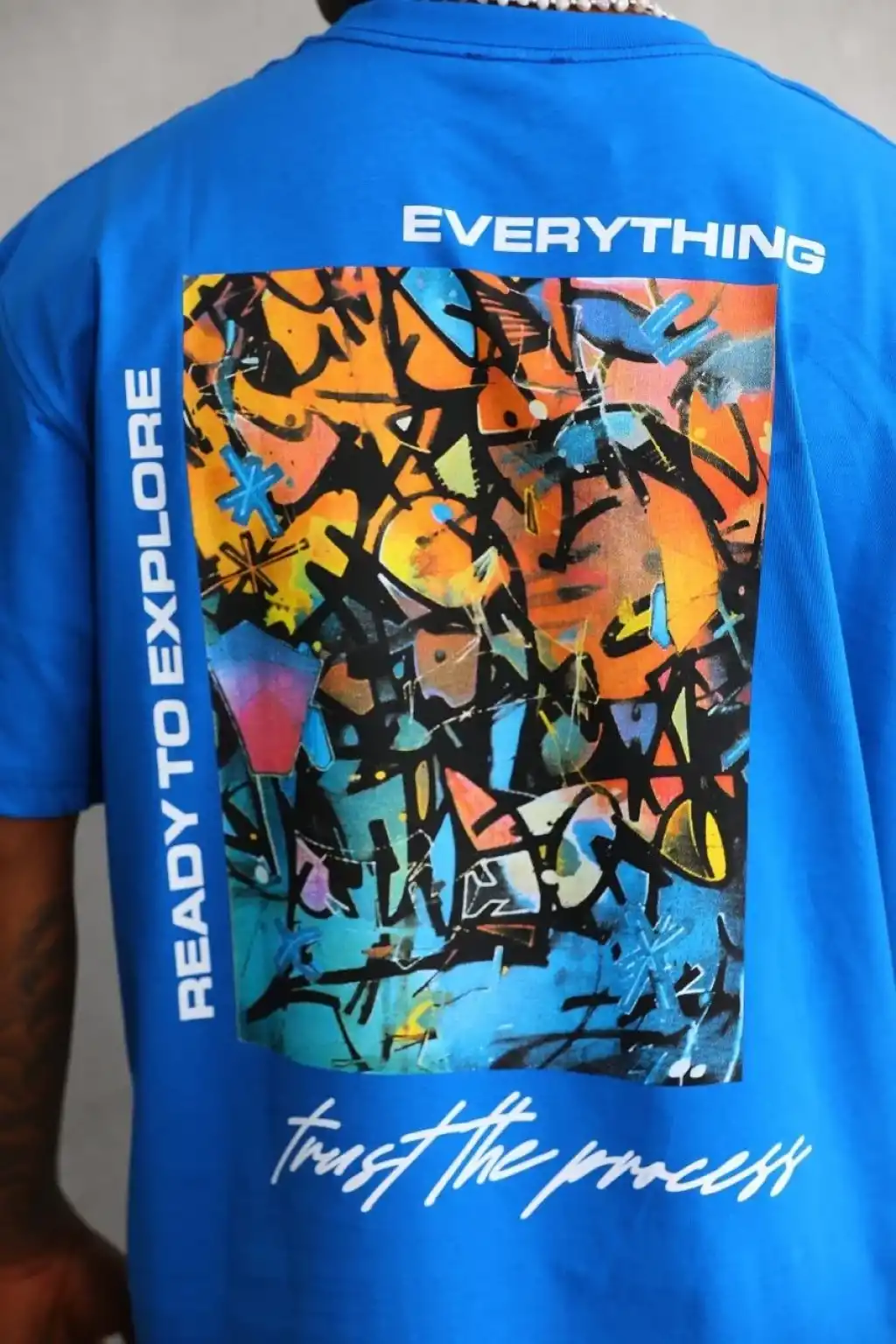 Unisex Bisiklet Yaka Baskılı Oversize T-Shirt - Mavi