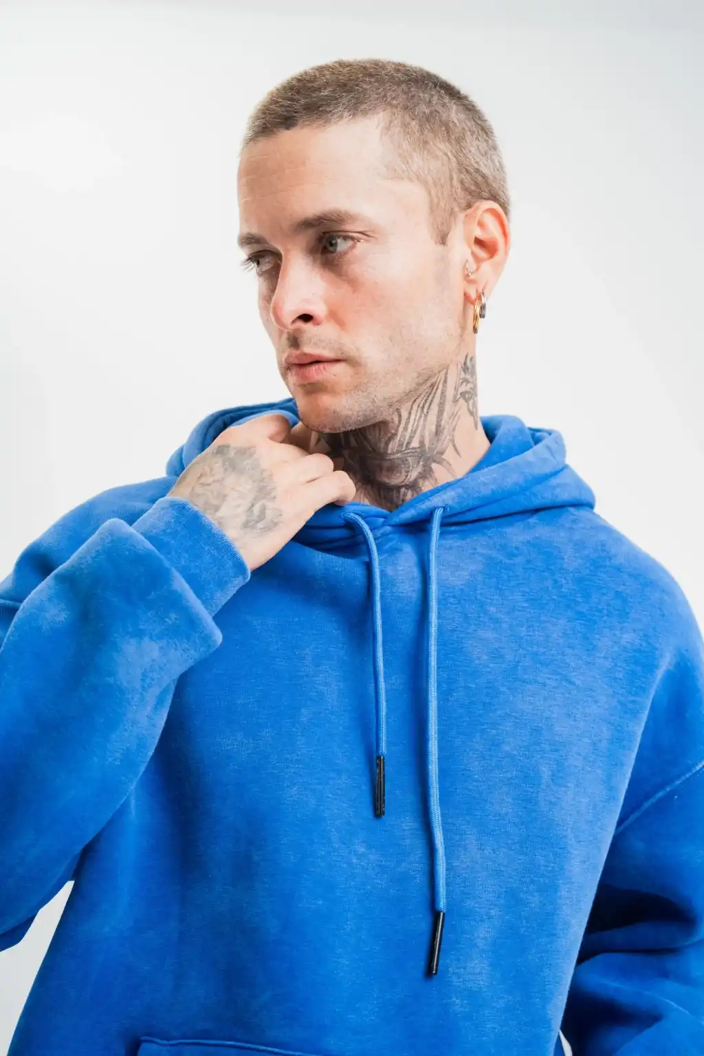Erkek Yağ Yıkamalı Kapşonlu Double Oversize Üç İplik Pamuklu Sweatshirt - Mavi
