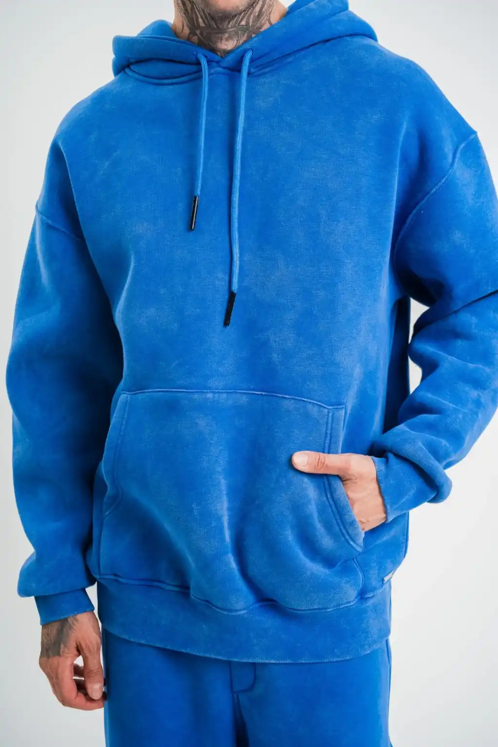 Erkek Saks Mavi Double Oversize 3 İplik Pamuklu Kapüşonlu Kanguru Cepli Sweatshirt Hoodie - Saks Mavi
