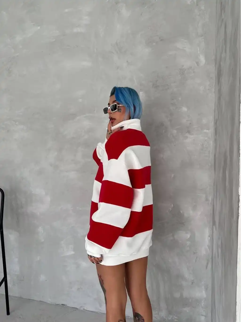 Unisex Üç İplik Parçalı Yakalı SweatShirt - Kırmızı