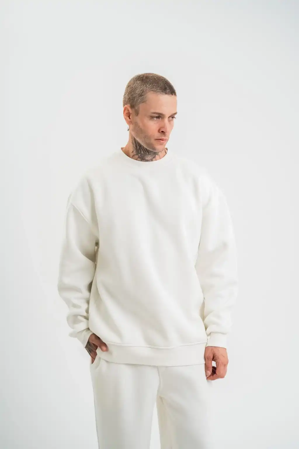 Erkek Patlı Yaka Üç İplik Pamuklu Sweatshirt Double Oversize Rahat Kalıp Günlük Kullanım – Bej