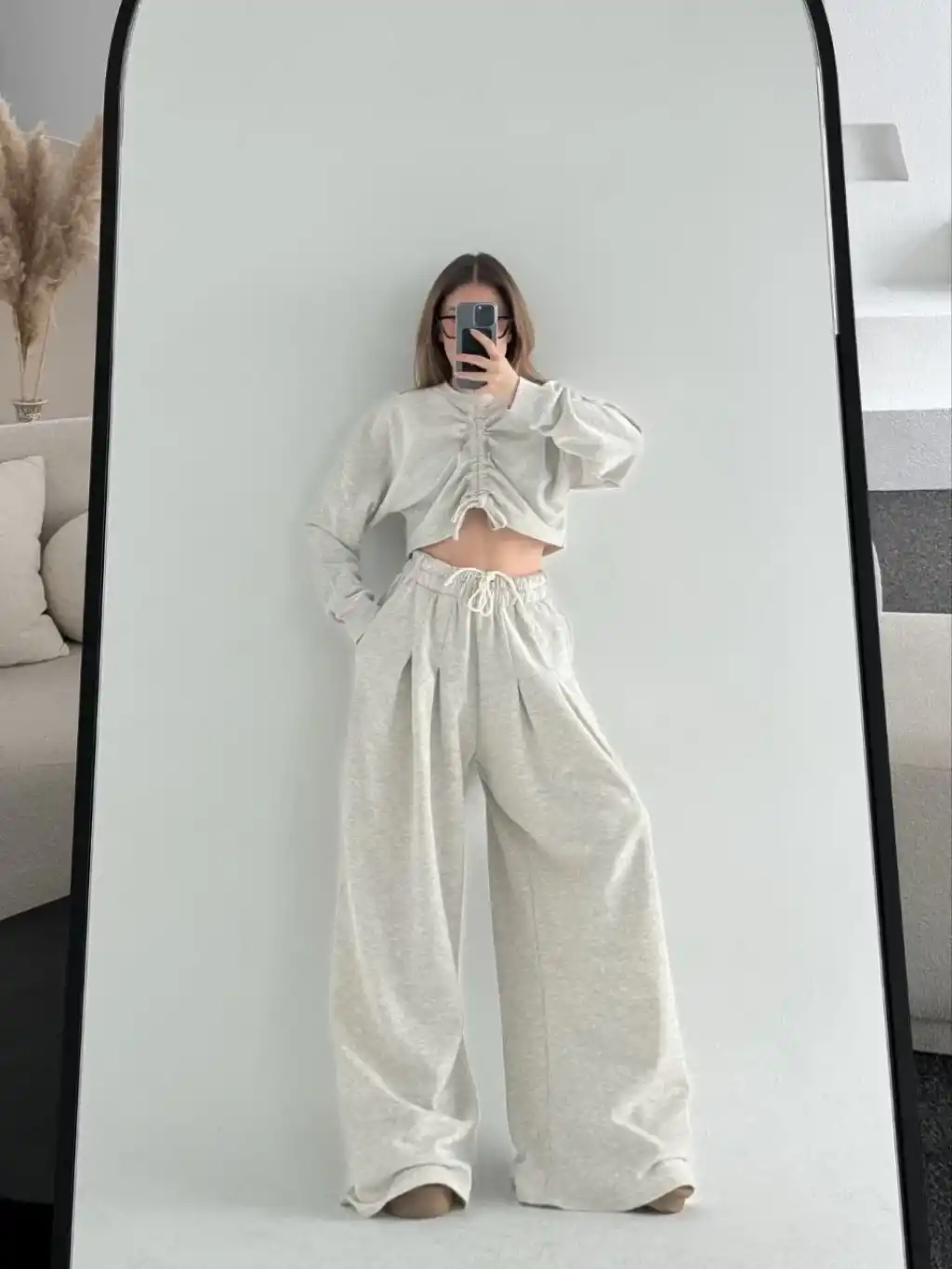 Uzun Kollu Önü İp Büzgülü Crop ve Pantolon İkili Takım - Gri