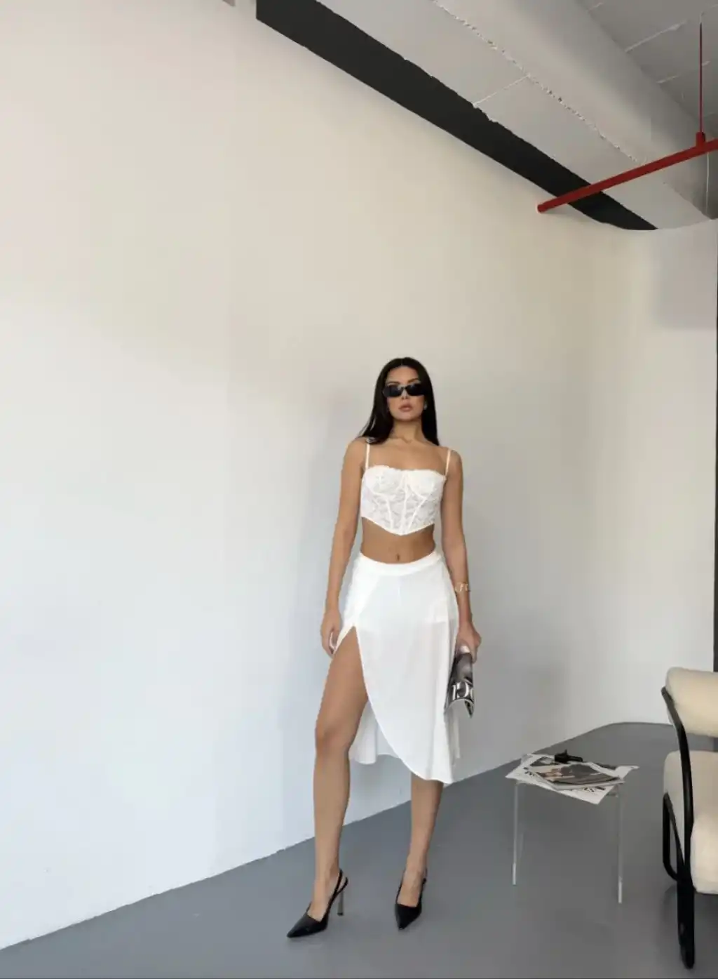 Çepli Şortlu Yırtmaçlı Etek - Beyaz