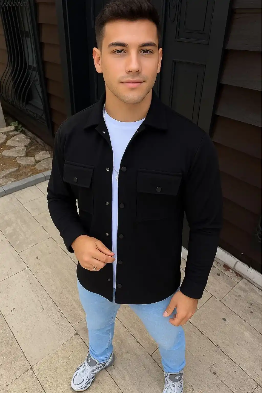 Erkek Diagonal Kumaş Cepli Çıtçıtlı uzun Kollu, Gömlek Oversize Rahat Kalıp Günlük Şık Stil - Siyah