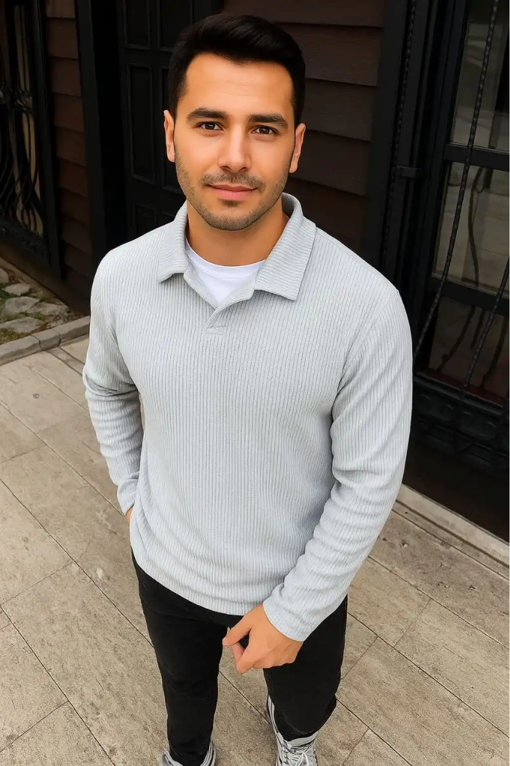 Erkek Fitilli Polar Sweatshirt – Düğmesiz Polo Yaka, Oversize Rahat Kalıp, Kalın Polar Kumaş, Kışlık ve Baharlık Şık Günlük Üst - Gri