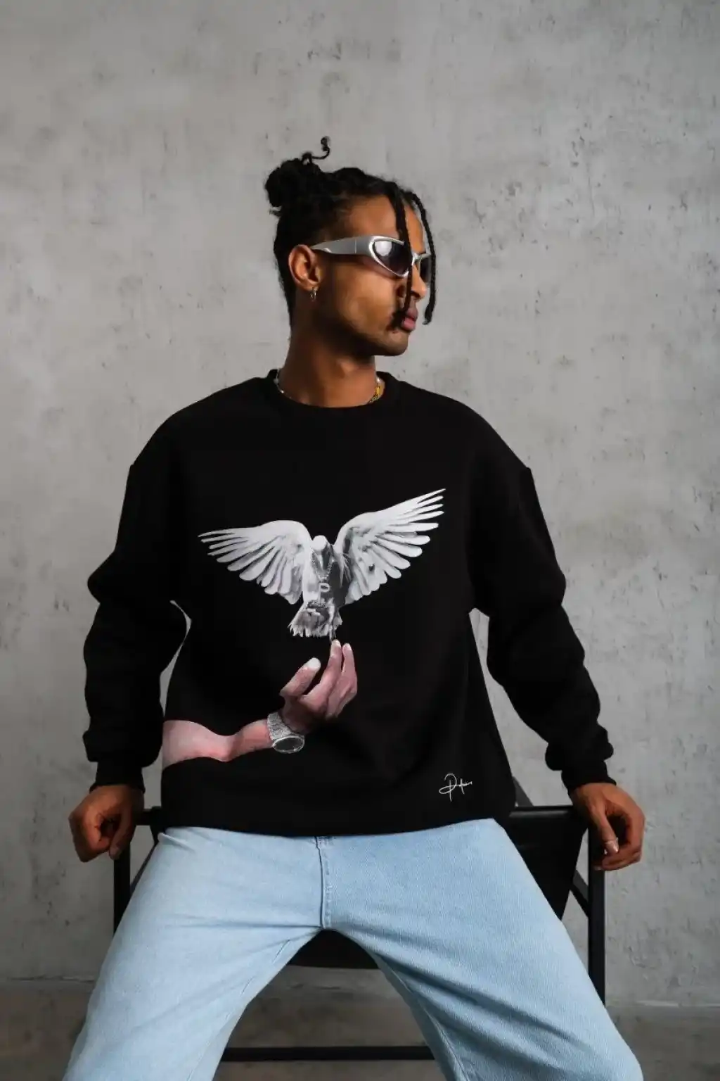 Erkek Güvercin Baskılı Sweatshirt - Siyah