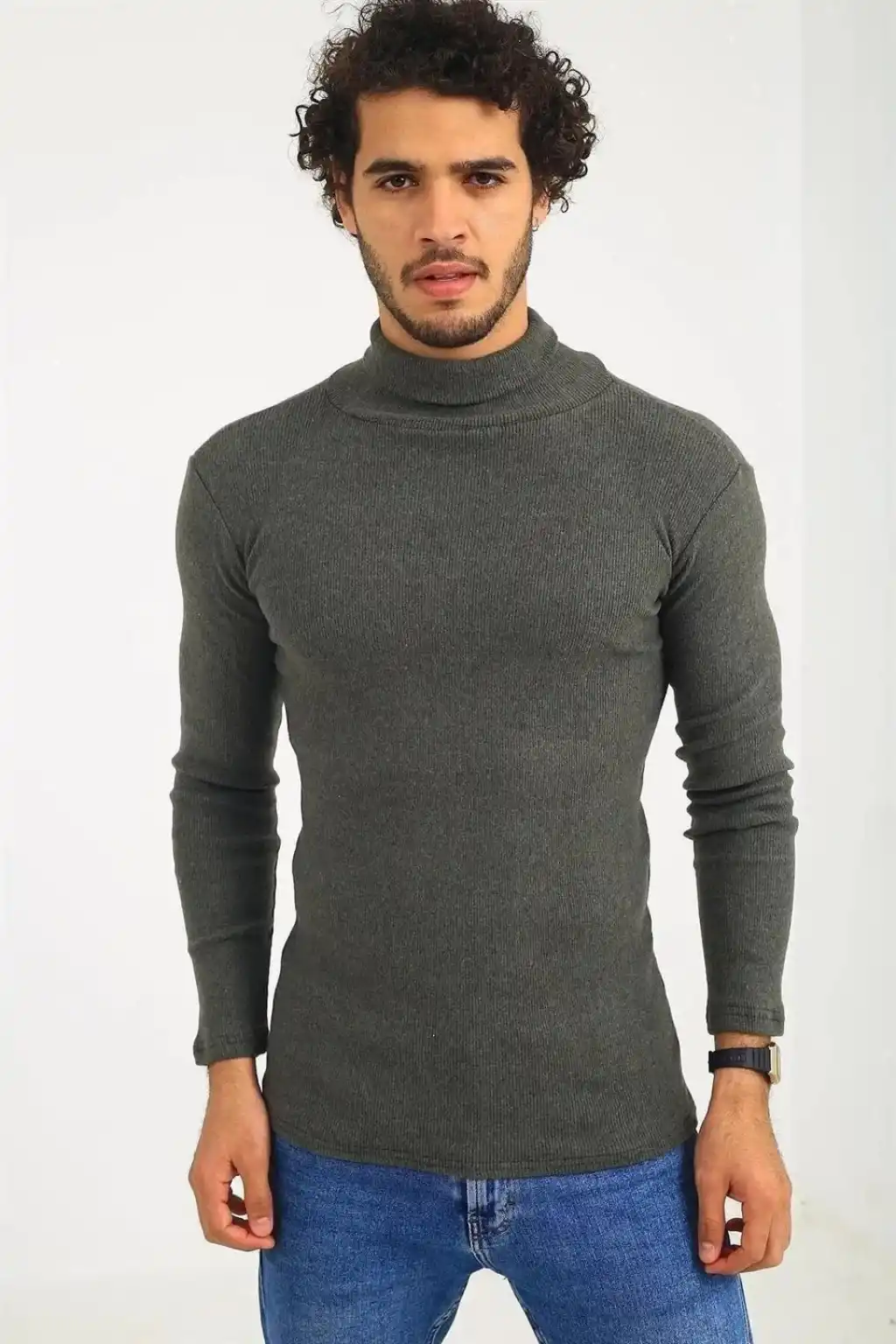 Erkek Kaşkorse Boğazlı Full Likralı Fitilli Body Kazak - Haki