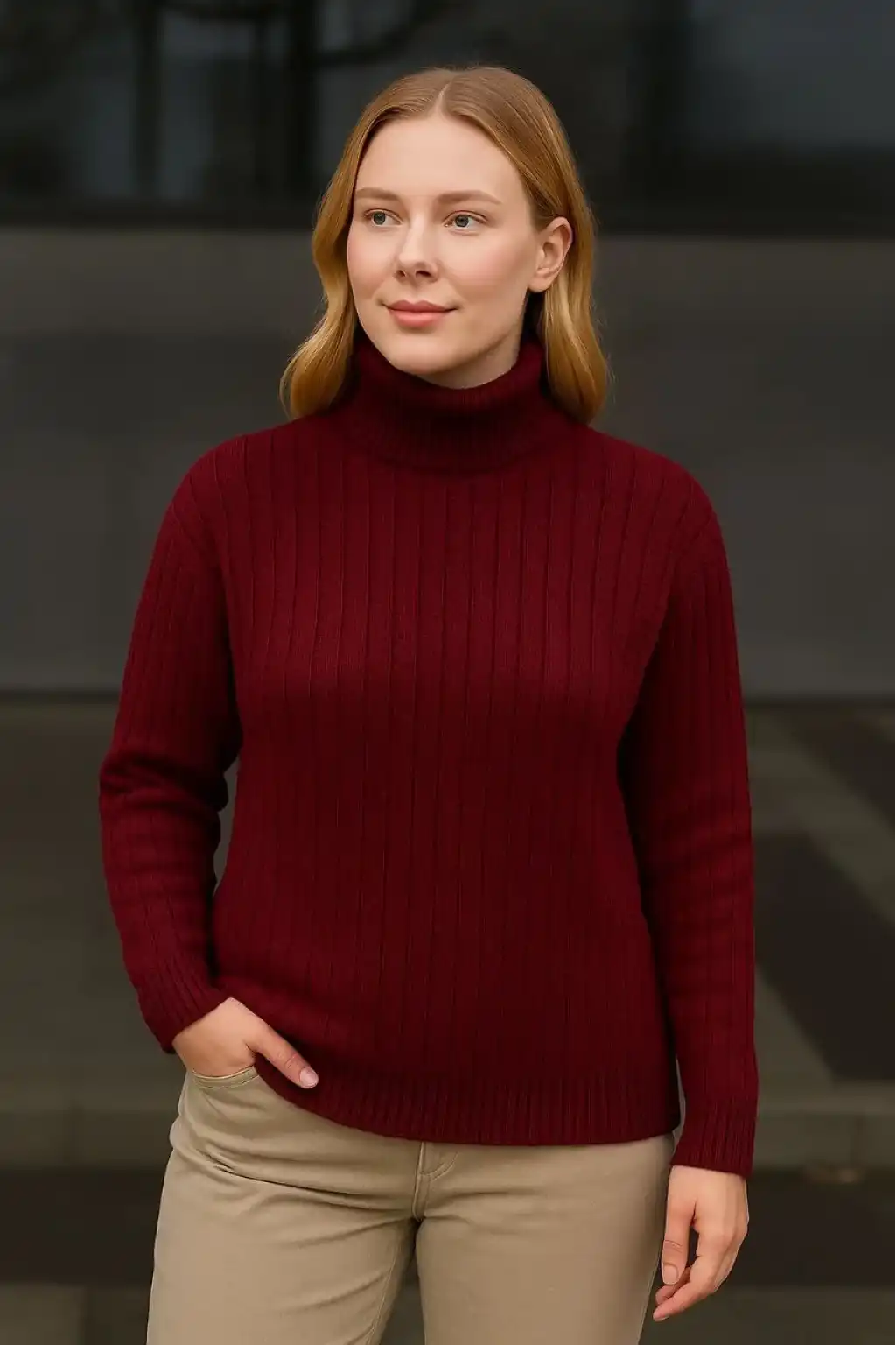 Kadın Balıkcı Yaka Bağazlı Triko Kazak Pamuklu Kalın Fitilli Dokuma - Bordo