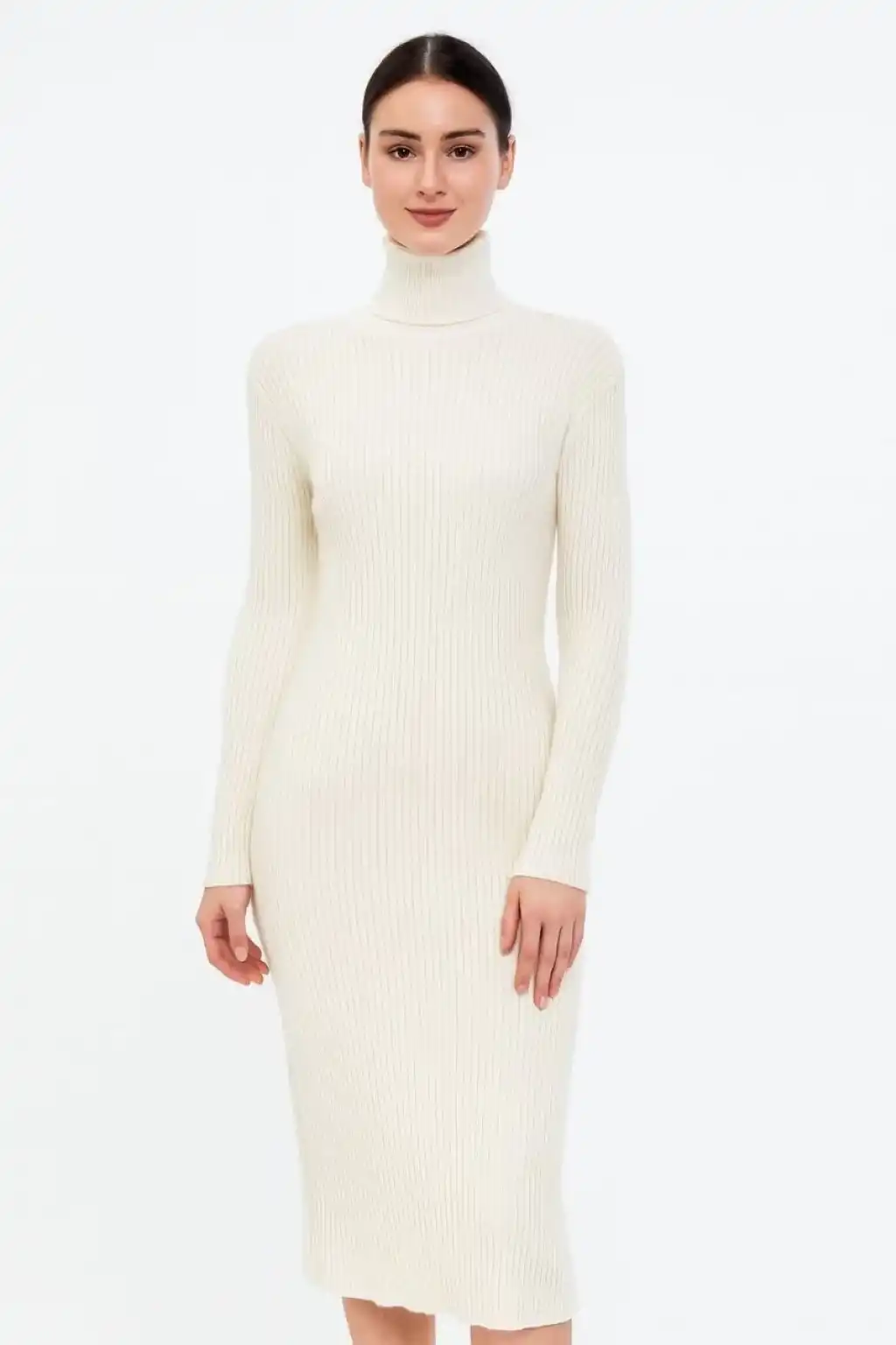 Kadın Boğazlı Triko Elbise – Uzun Fitilli Esnek Dokuma, Tam Kalıp, Kışlık & Baharlık Şık Rahat Stil, 130 cm Midi Boy Elbise - Beyaz