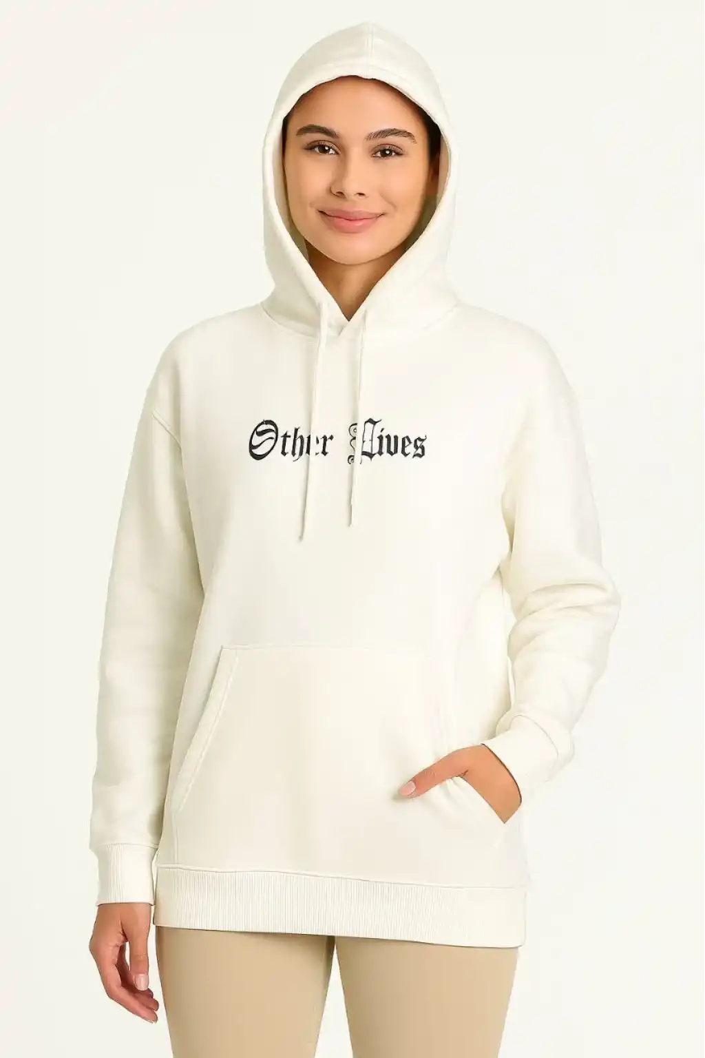 Kadın Oversize Üç İplik Şardonlu Kapüşonlu Sweatshirt – Beyaz “Other Lives” Ön ve Arka Baskılı, Kanguru Cepli, Ribanalı Rahat Kışlık Model Beyaz