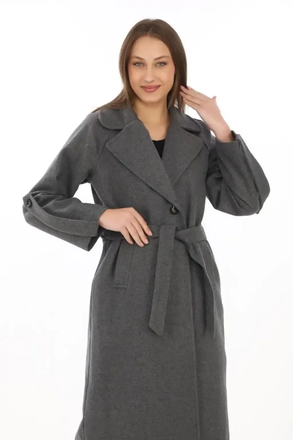 Kadın Kolu Apoletli Astarlı Kaşmir Kaşe Kaban - Füme