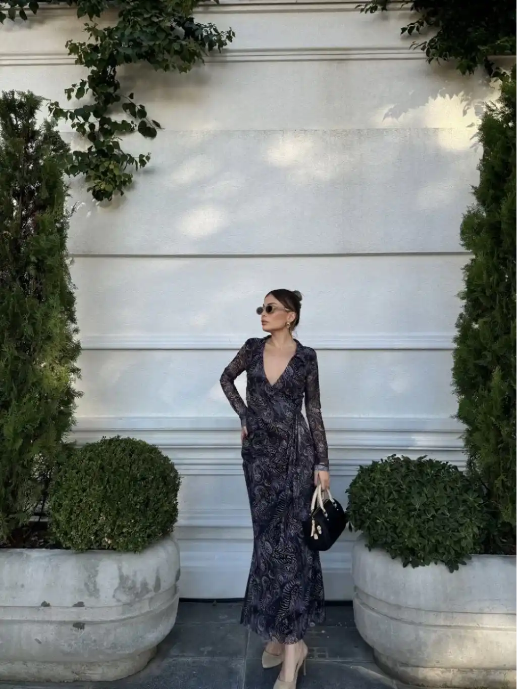 Kruvaze V yaka, fırfırlı ve bağcıklı Desenli Bluz ve Midi Etek Takım - Siyah