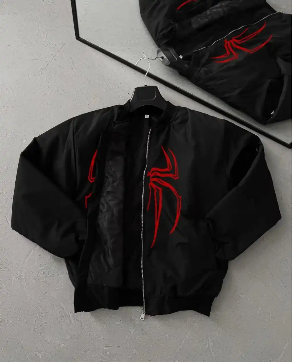 Örümcek Desenli Siyah Bomber Mont – Unisex Kullanıma Uygun, Fermuarlı Cepli, Kapitone Astarlı, Bahar Kış Günlük Giyim İçin Moda Ceket Modeli - Siyah