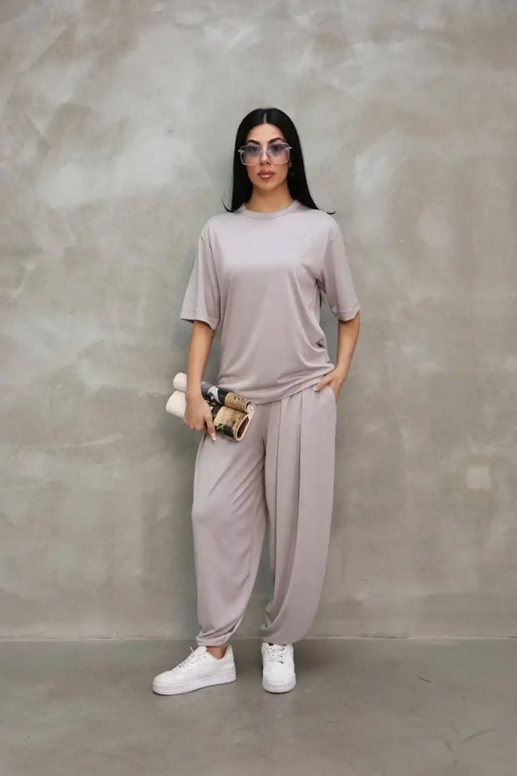 Osy Modal Yumuşak Dokulu Kumaş Kısa Kollu Bluz Rahat Pantalon ikili Takım- Kahverengi