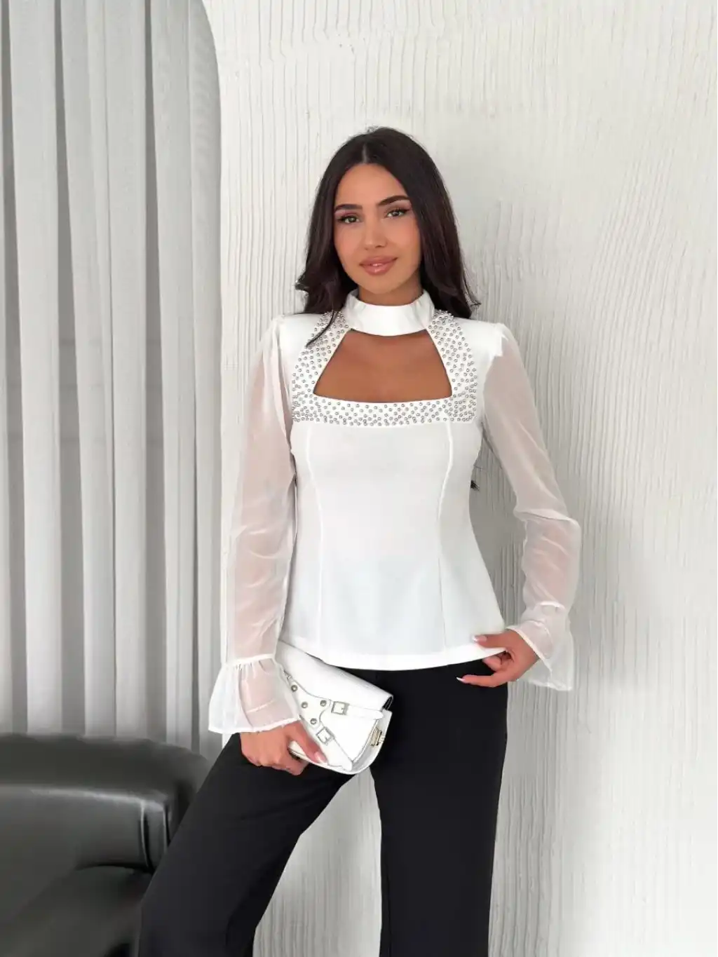 Penye Uzun Kollu Kadın Kolları Şifon Göğüste İnci Boncuk detaylı Bluz - Beyaz