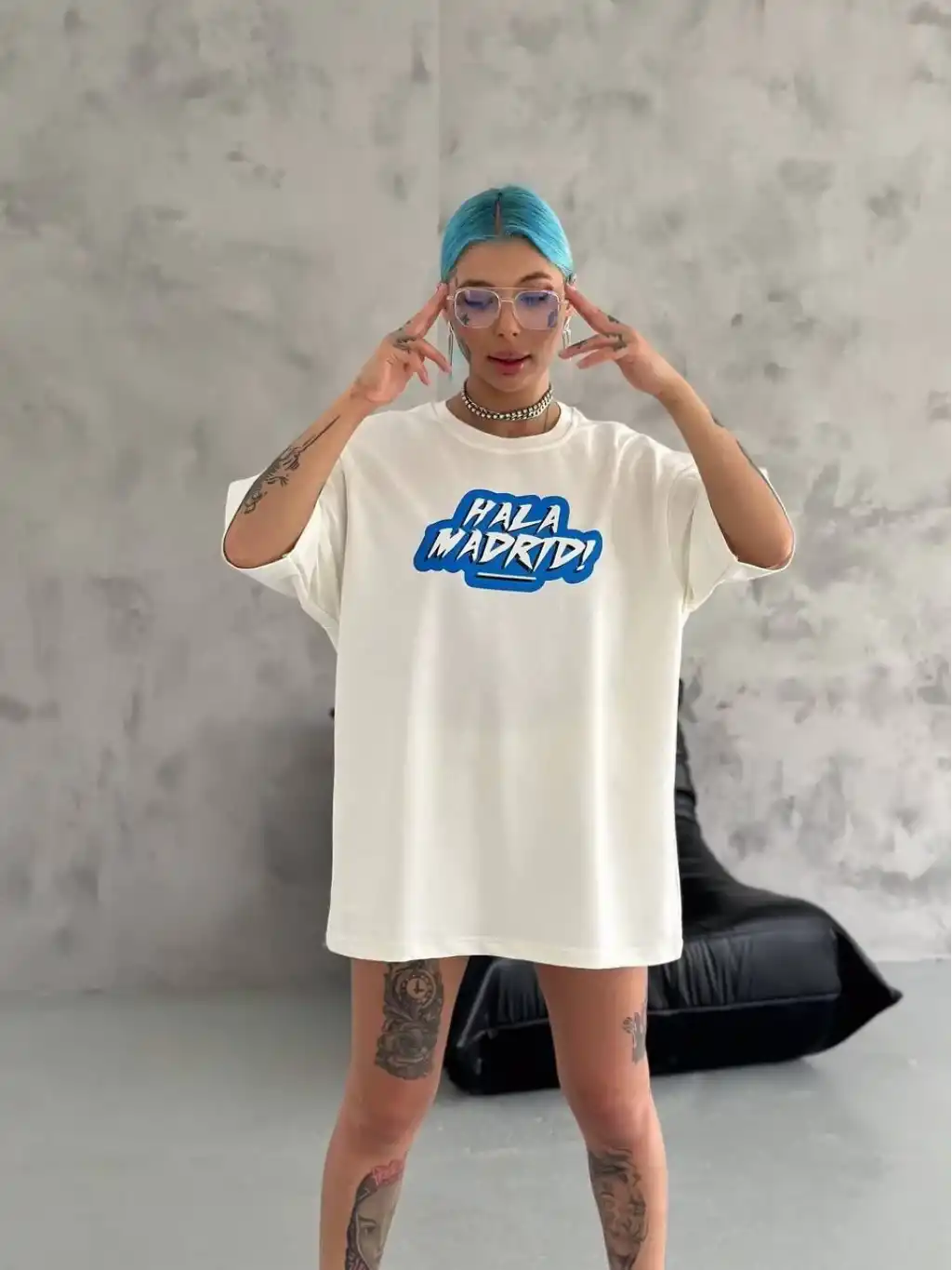 AICG Ön Arka Baskılı Bisiklet Yaka Kadın Oversize Bisiklet Yaka T-shirt - Beyaz