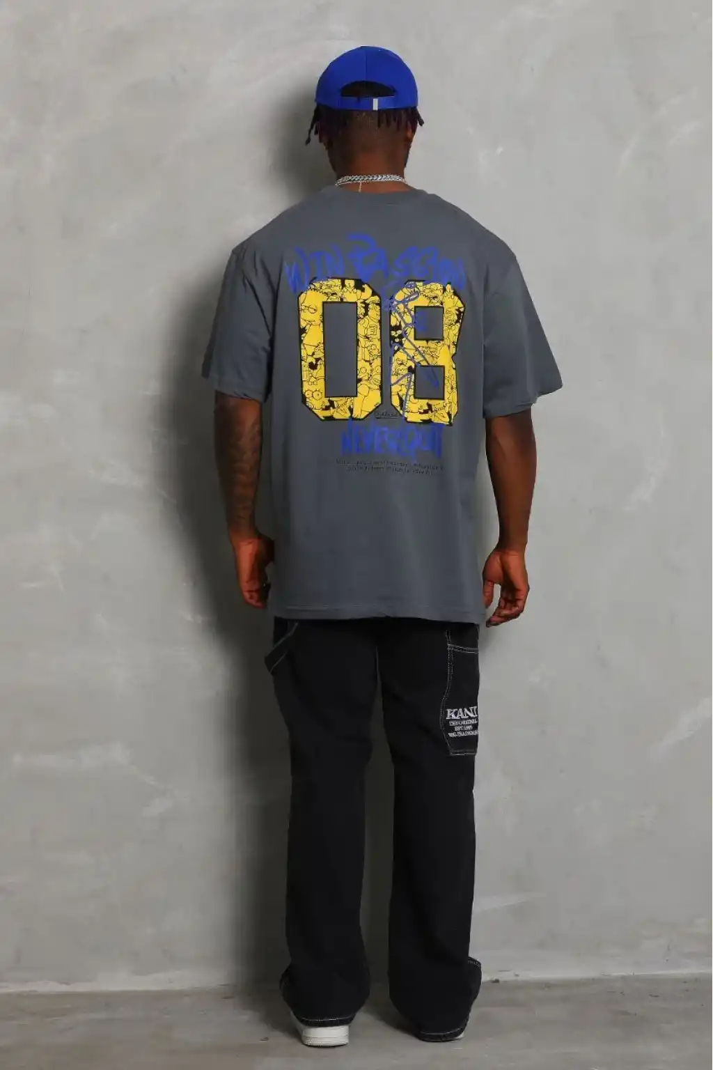 Unisex Oversize Baskılı Bisiklet Yaka T-Shirt - Füme