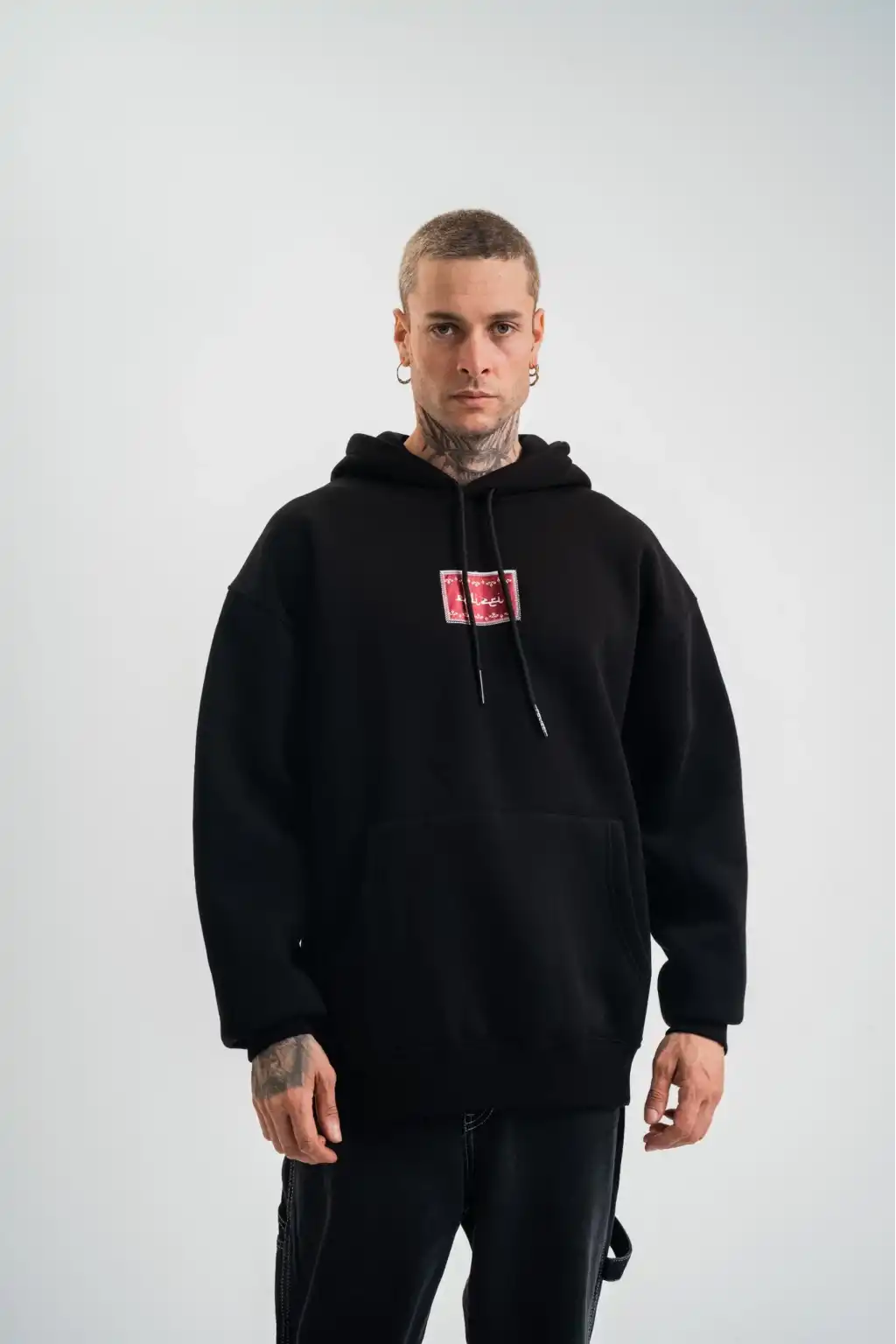 Erkek Oversize Kapüşonlu Sweatshirt – Siyah Renk Üç İplik İçi Pamuklu Kanguru Cepli Baskılı Hoodie Rahat Kalıp Kışlık Günlük Kombinlere Uygun - Siyah