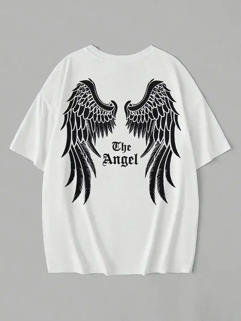 20/1 Penye Compack Dark Angel Baskılı Oversize Kısa Kol Yazlık T-shirt- Beyaz