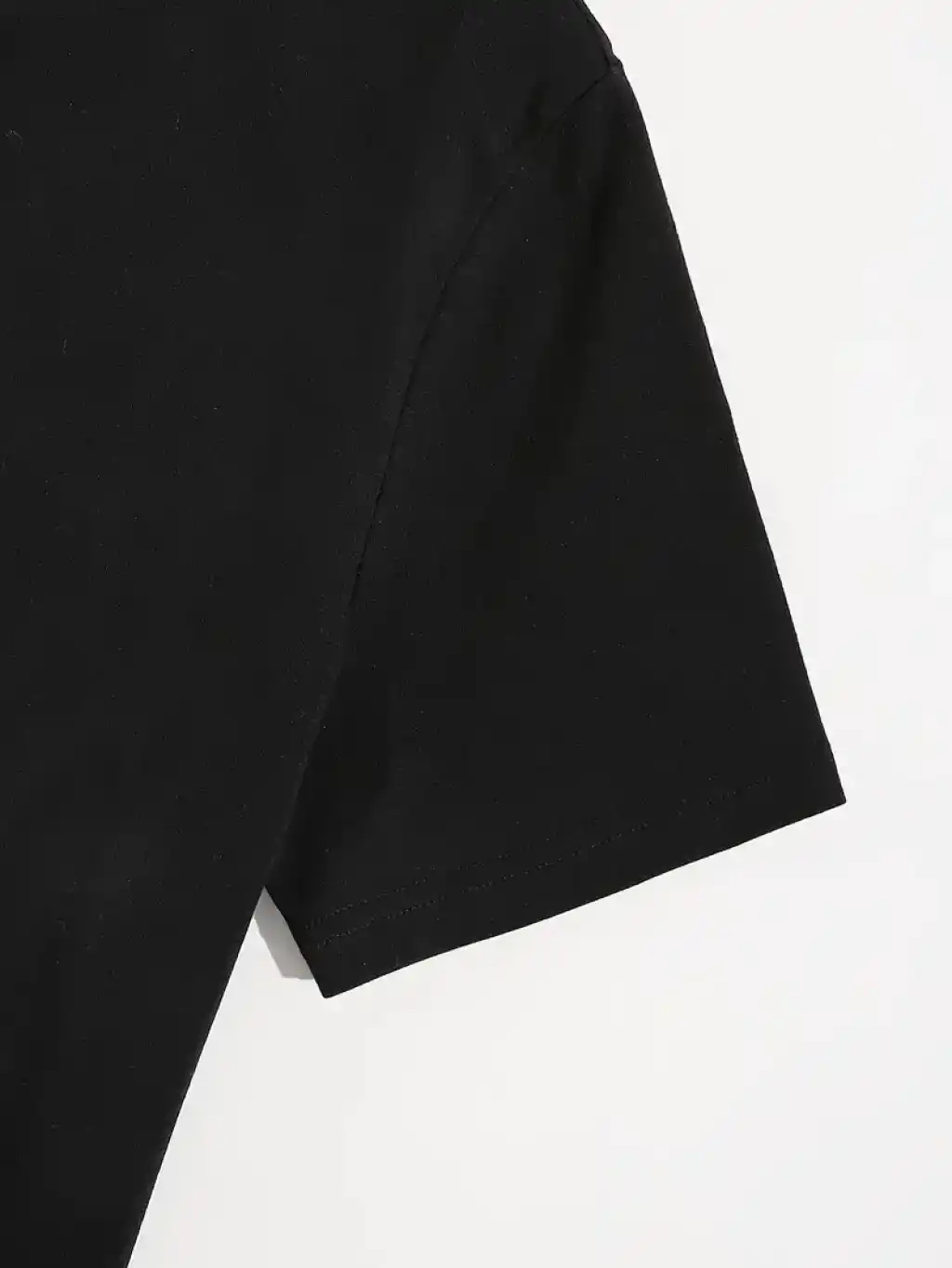Rahat Bisiklet Yaka Tişört, Yaratıcı Karikatür Baskı - Yumuşak Polyester, Her Mevsim Giyilebilir- Siyah
