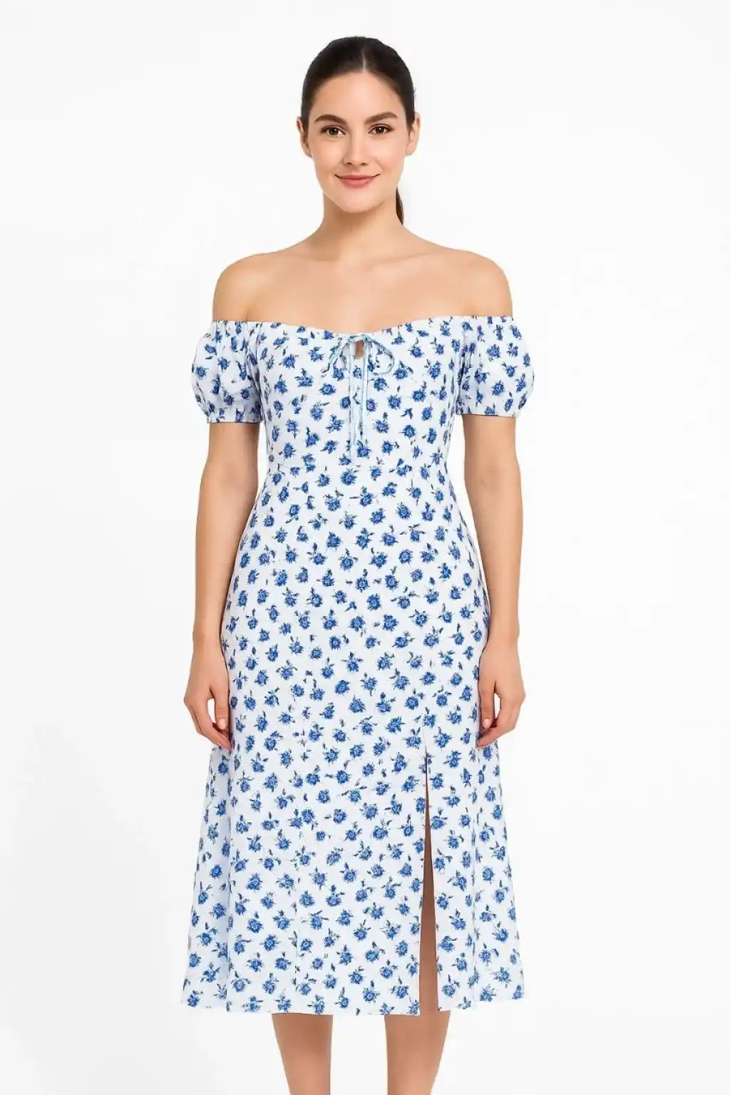 Bardot Omuzu Acık Çiçek Desenli Elbise - Desenli