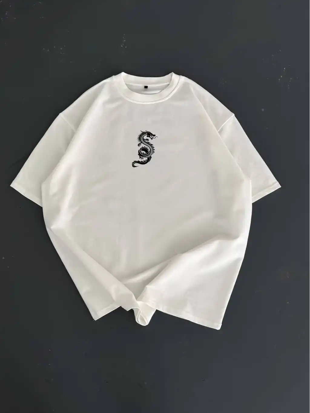 20/1 Penye Compack Ön Arka Ejder Baskılı Oversize Bisiklet Yaka T-shirt - Beyaz