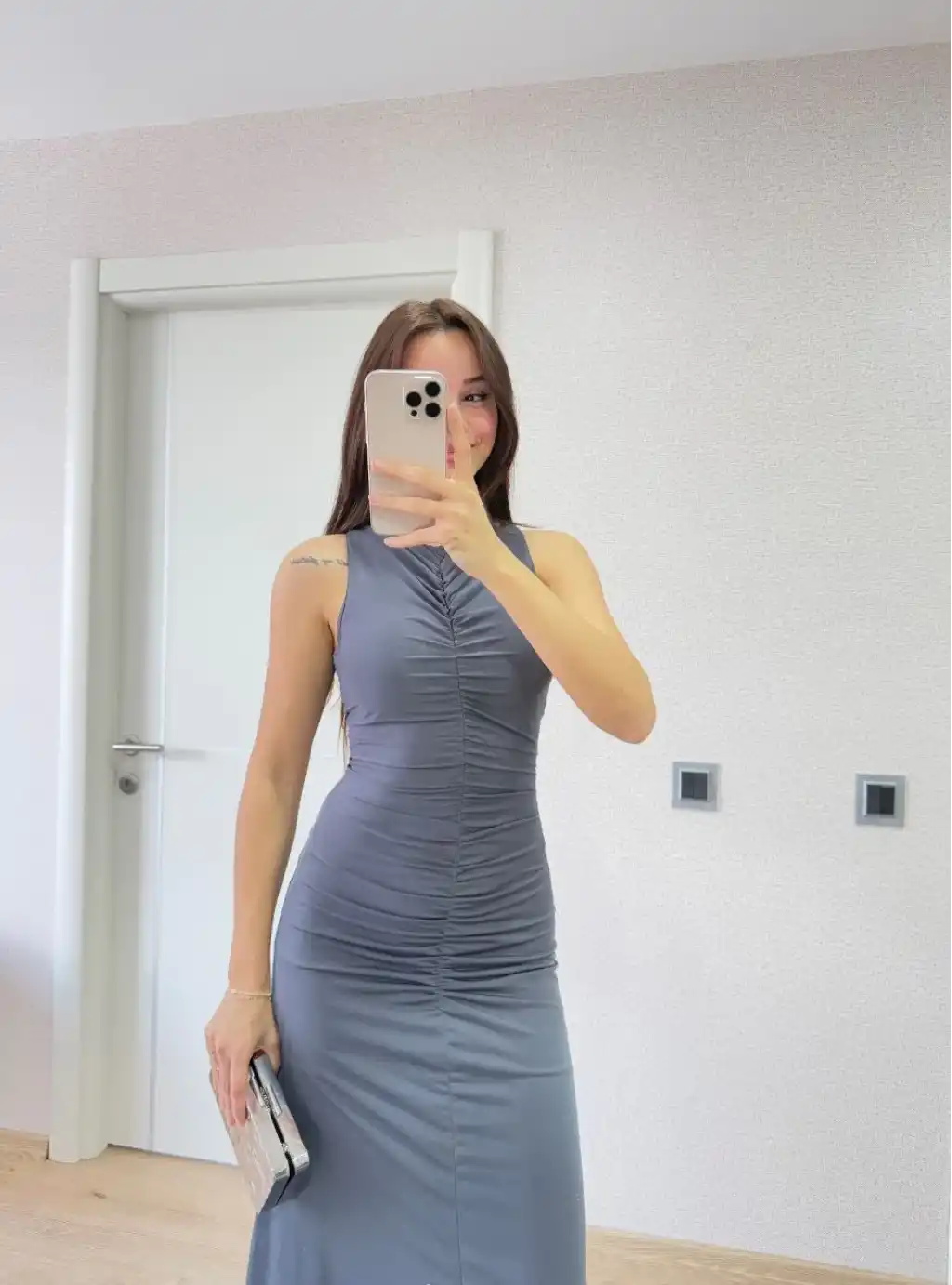 Bürümcük Kumaşlı İçi Astarlı Üzgülü Kolsuz Büzgülü Uzun Elbise - Füme