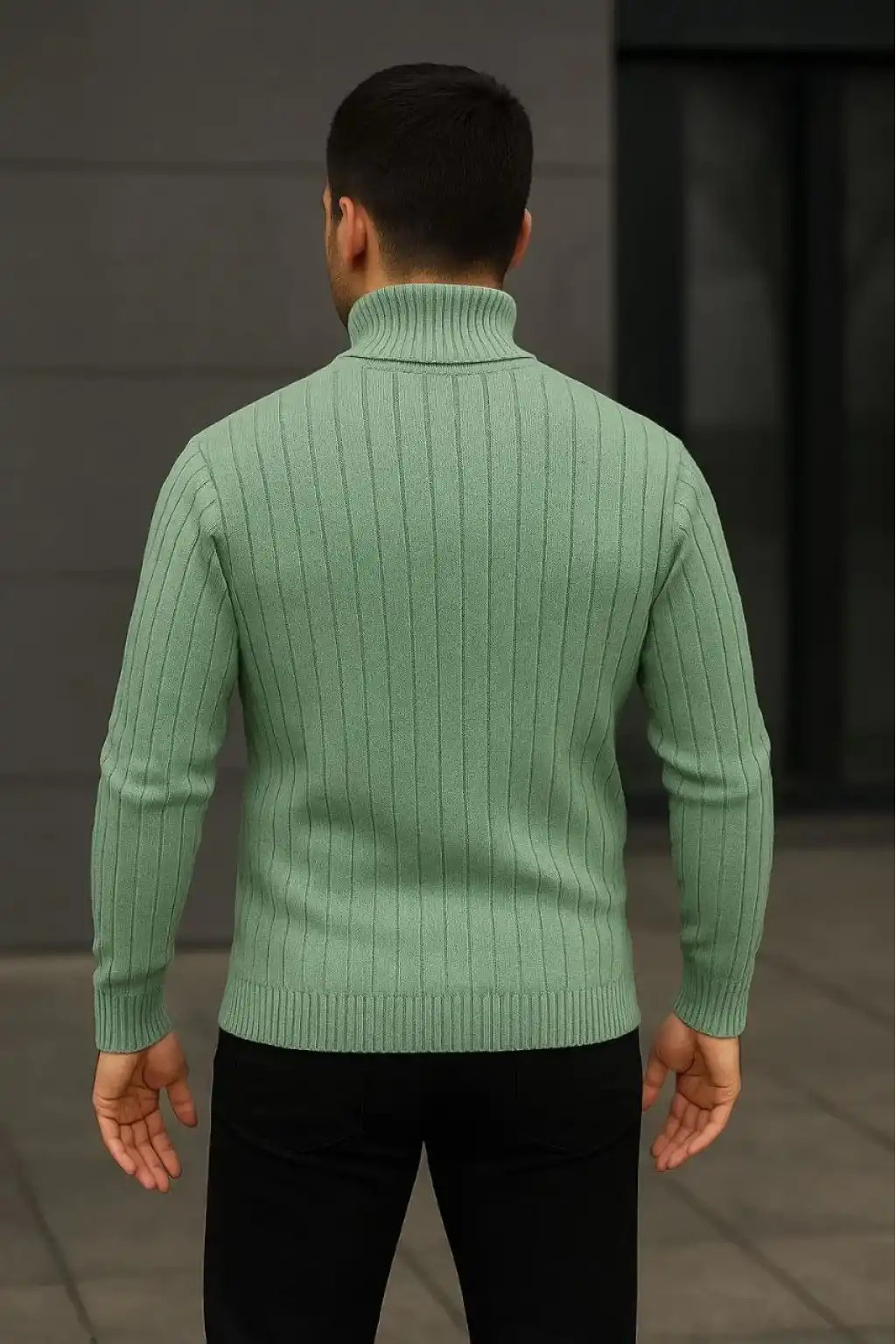 Erkek Balıkcı Yaka Bağazlı Triko Kazak Pamuklu Kalın Fitilli Dokuma, Regular Fit Uzun Kollu Kışlık Model - Mint Yeşili
